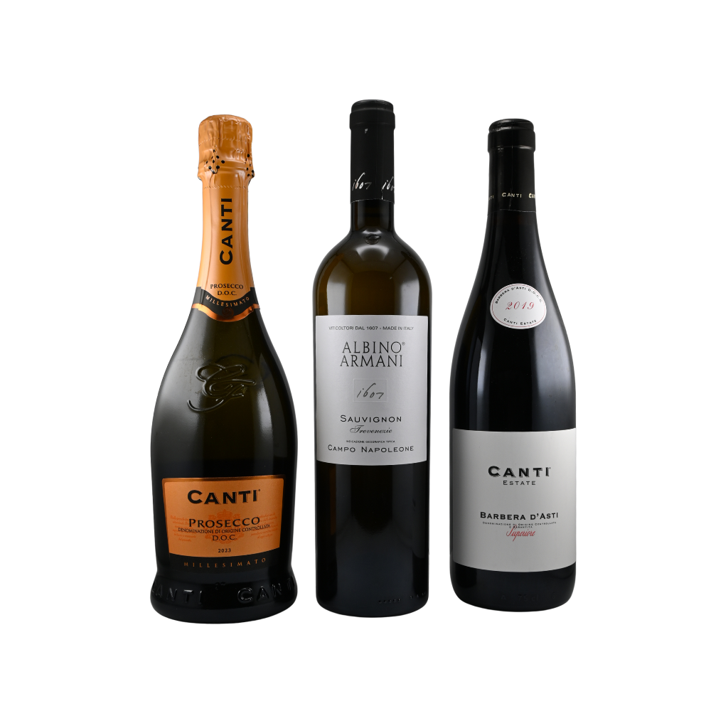 Dieses Weinpaket vereint drei ausgewählte Weine aus den nördlichen Regionen Italiens und steht für feine Aromen, elegante Strukturen und authentischen Genuss. Der Canti Prosecco DOC Extra Dry 2023 begeistert mit seiner leichten Perlage und frischen, fruchtigen Noten – ein spritziger Auftakt voller Eleganz. Der Albino Armani Sauvignon Blanc, Campo Napoleone IGT Venezie 2023 präsentiert sich aromatisch und frisch, mit klaren Zitrus- und Kräuternuancen, die die Leichtigkeit des venezianischen Terroirs widerspiegeln. Abgerundet wird das Paket durch den Canti Rossa Barbera d’Asti 2019, dessen intensive Frucht und geschmeidige Textur die Tradition piemontesischer Rotweine auf besonders harmonische Weise einfängt.