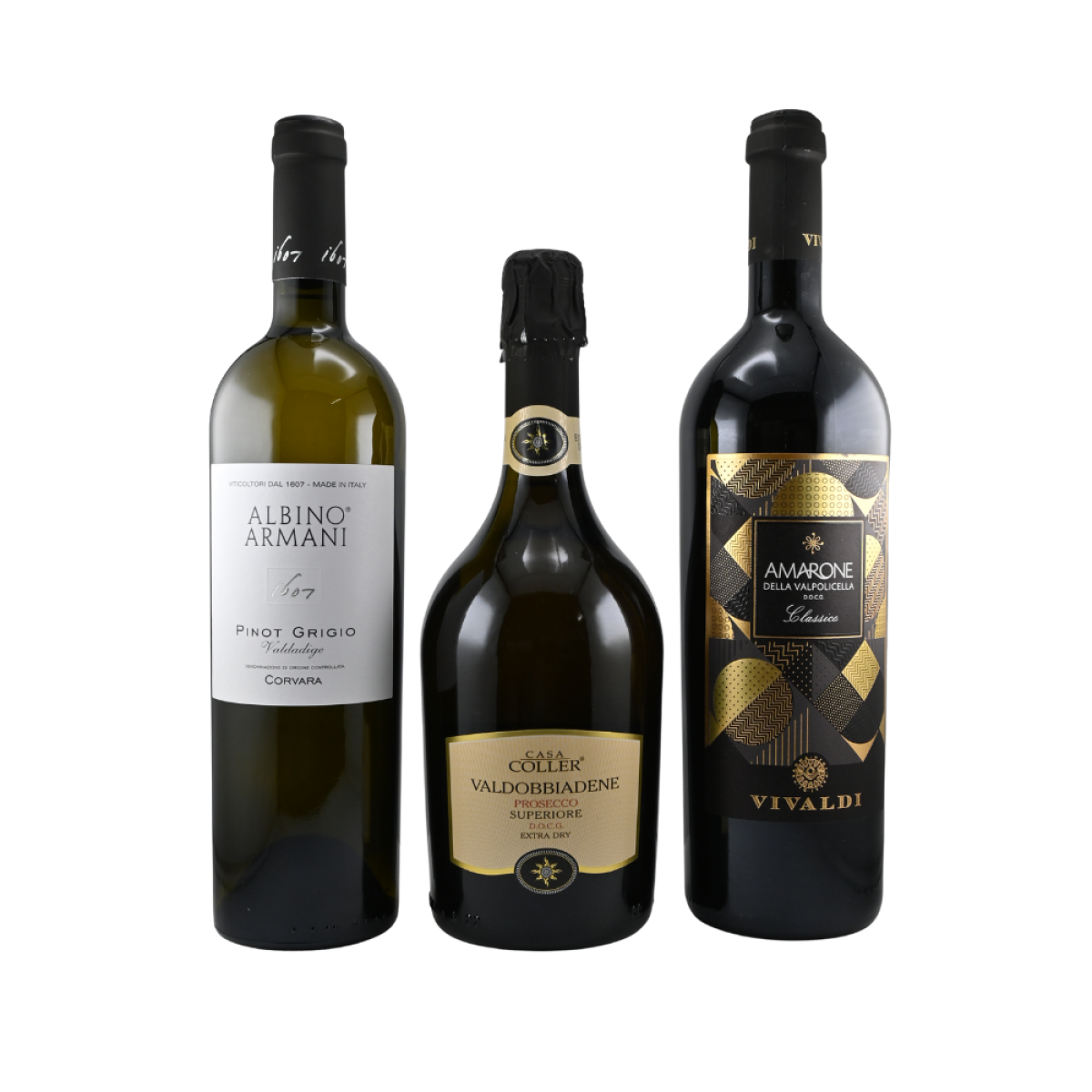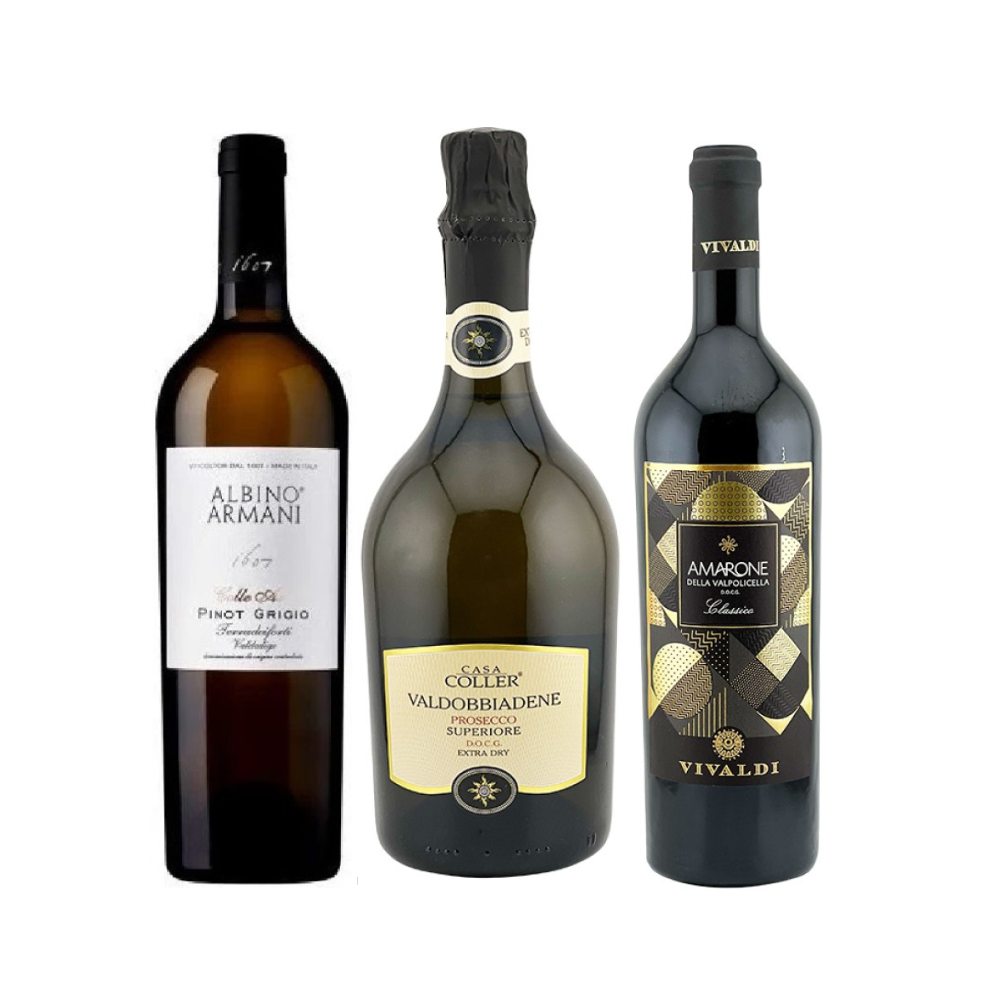 Dieses exklusive Weinpaket vereint drei herausragende italienische Weine, die für Stil, Charakter und höchsten Genuss stehen. Der Casa Coller Valdobbiadene Prosecco Superiore Extra Dry DOCG eröffnet das Paket mit seiner feinen, anmutigen Perlage und einem frischen Bouquet aus grünem Apfel, Birne und zarten Blütennoten. Der Albino Armani Pinot Grigio 2023 präsentiert sich klar, modern und erfrischend. Mit Aromen von Zitrusfrüchten, gelbem Apfel und einem Hauch mediterraner Kräuter überzeugt er durch eine elegante, lebendige Struktur. Den kraftvollen Abschluss bildet der Vivaldi Amarone della Valpolicella DOCG Classico Premium 2021, ein Wein voller Tiefe und Intensität. Seine Noten von dunklen Beeren, getrockneten Früchten, Kakao und Gewürzen verleihen ihm eine beeindruckende Komplexität.
